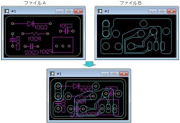 PloCompは複数のHPGL/ベクター/イメージファイルの図面を重ねて、並べて見るためのビューワです。印刷配線板のように複数の図面を重ねて製品となる図面のチェック、あるいは、色違い、雲マークによる変更領域認識で新旧の図面比較を行いたいなどに有効です。