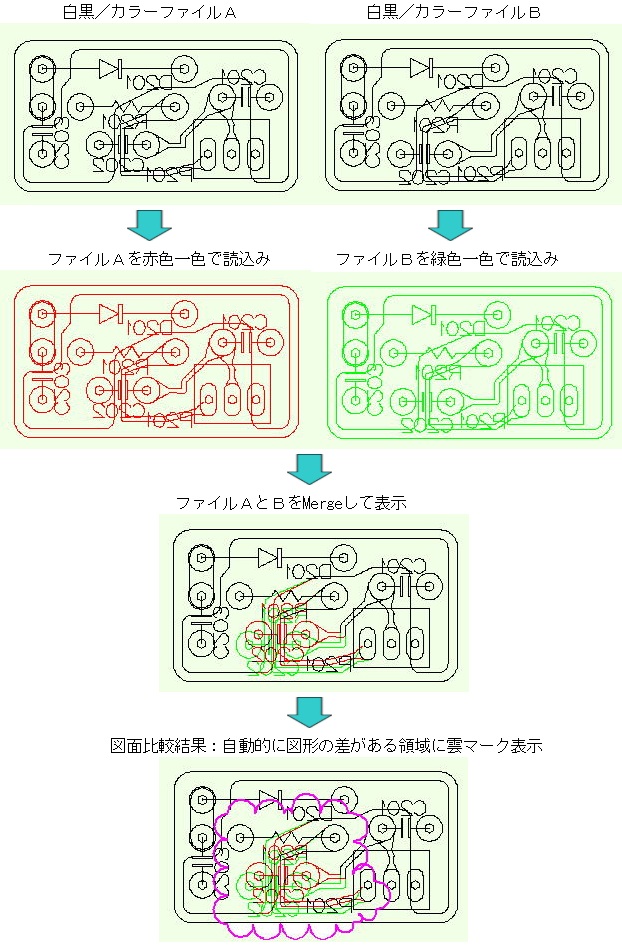 図面を色違いに重ねて比較、変更領域に雲マーク自動付加